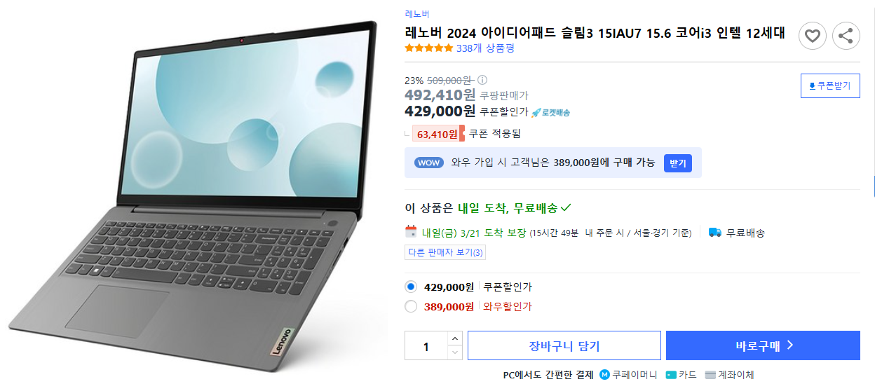 🛒 지금 바로 구매하세요!가성비 노트북의 최강자, 레노버 아이디어패드 슬림 3를 40만 원 초반대 가격에 만나보세요!